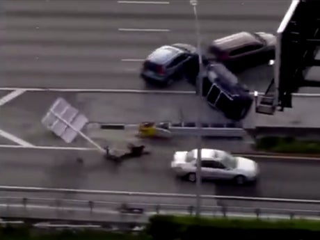 It ends with a stolen SUV colliding with a barrier and flipping over. Almost half a dozen other vehicles are forced to steer out of the way.