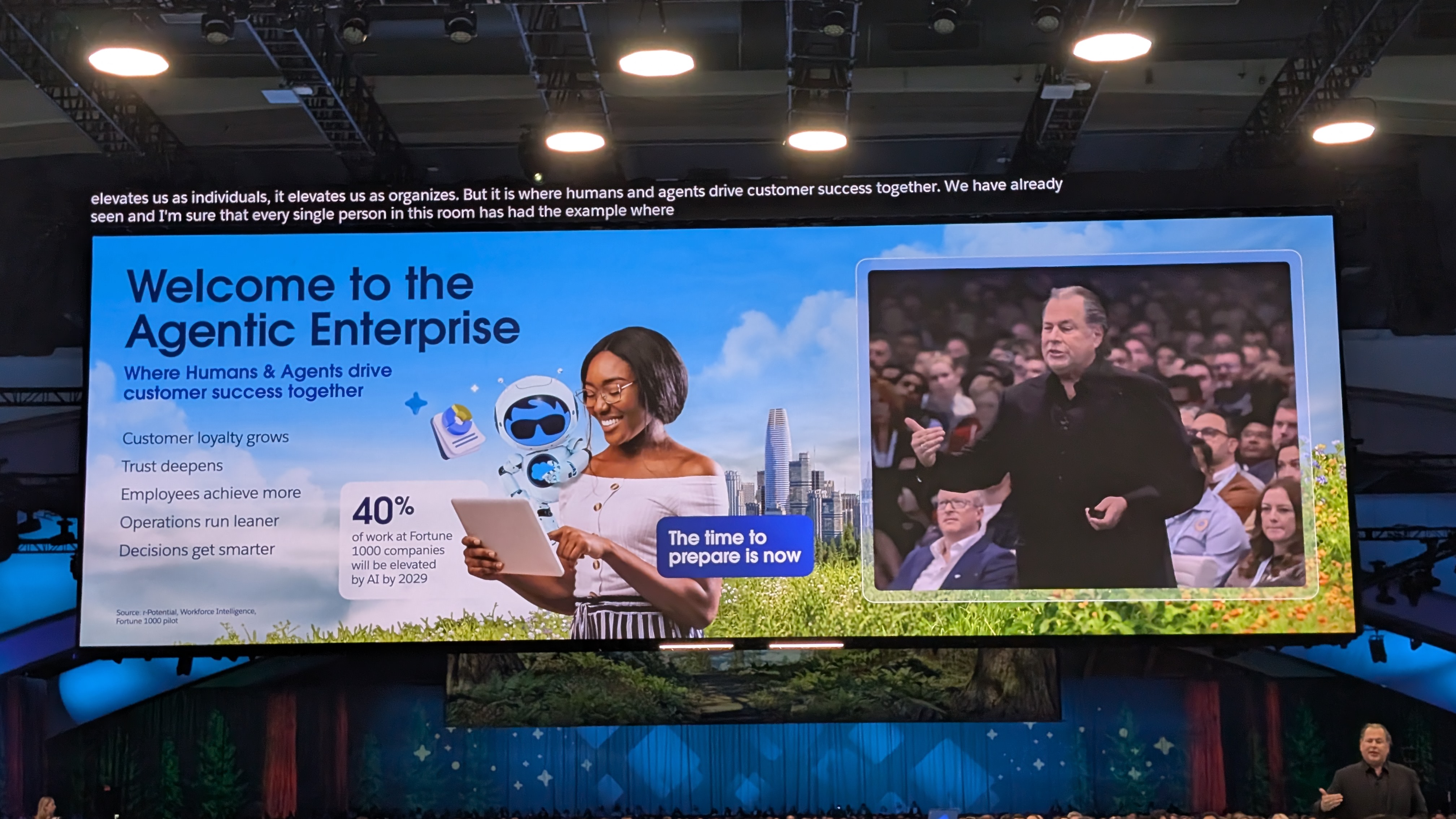 "What if everyone had the power to build agentic enteprises?" Benioff says, leaving the stage, as it's time for demos.