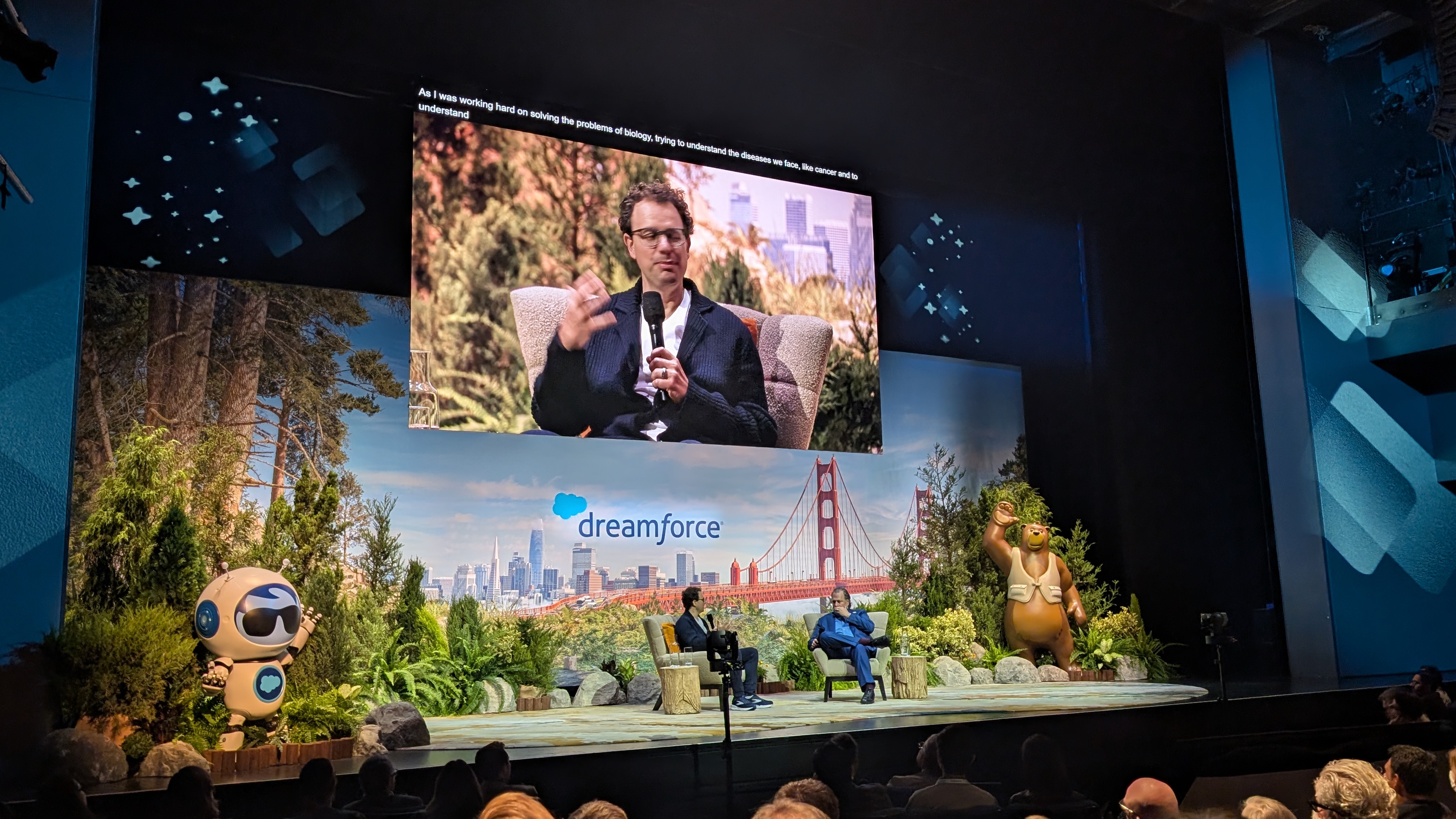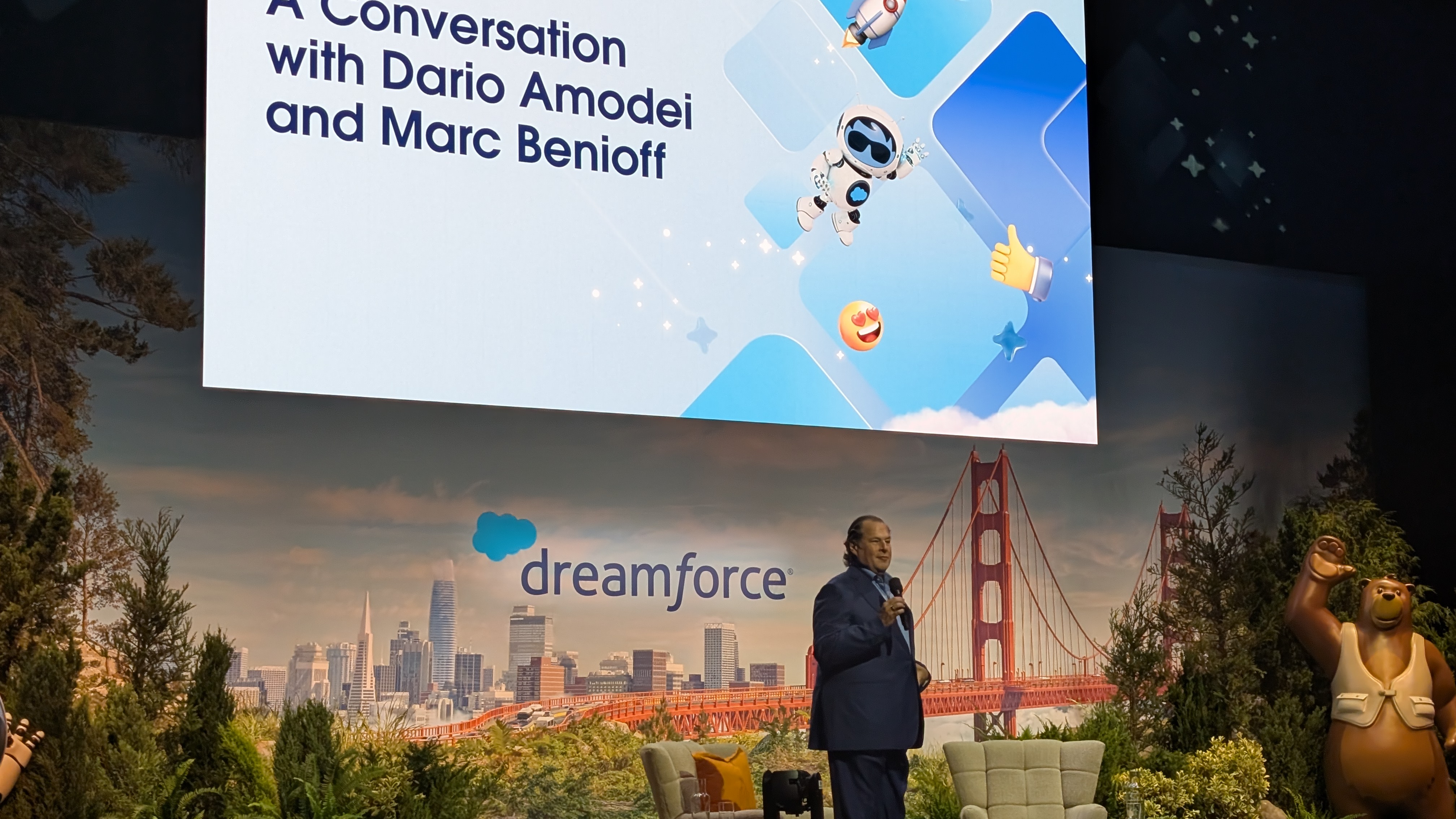 After the usual McConaghey-fronted video about the benefits of AI, Marc Benioff welcomes Dario Amodei to the stage.
