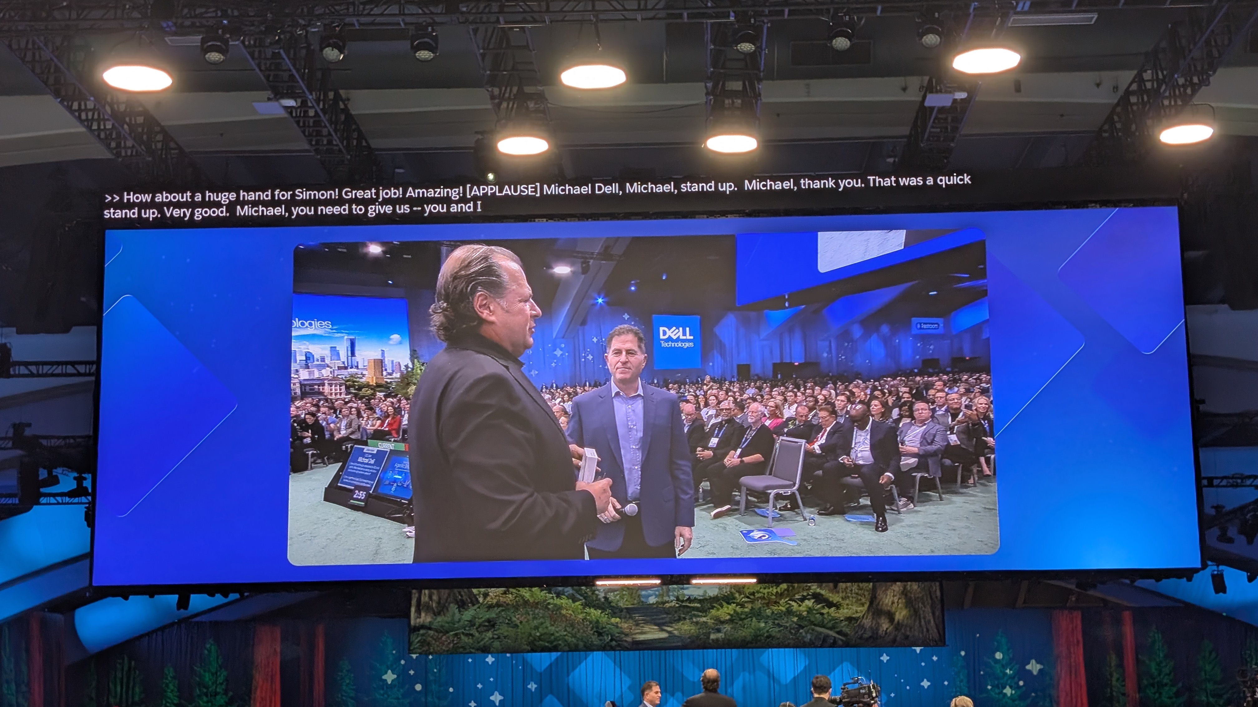 Company founder and CEO Michael Dell is here, and Benioff pulls him up to ask about the future of agentic AI in businesses.
