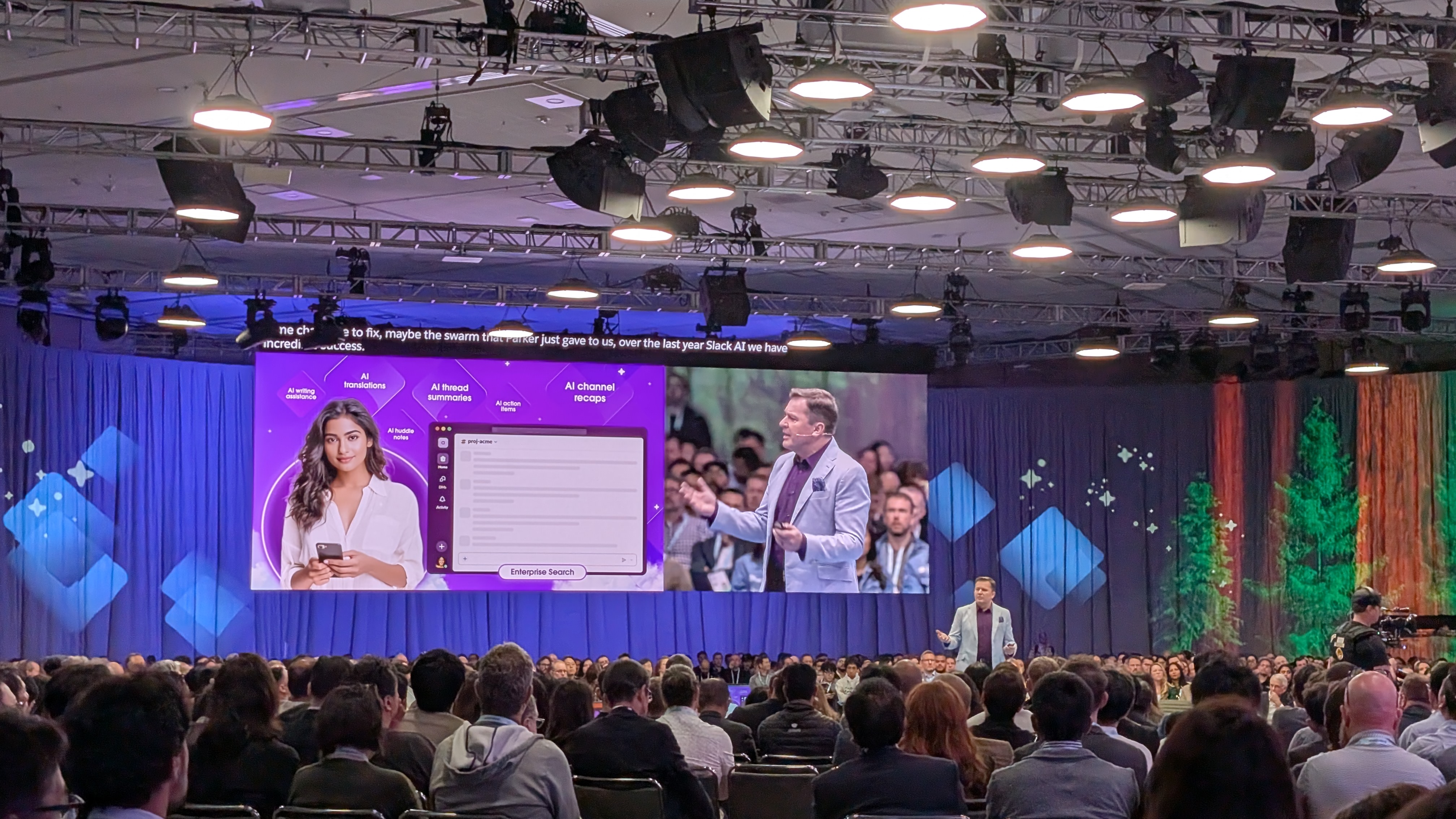After a demo of some of Agentforce working in Slack, Harris moves on to Slack's own AI features, and introduces Peter Doolan, EVP & Chief Customer Officer, Slack, on stage.