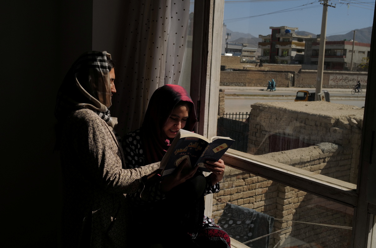 Hawa, 20, a third-year Russian literature student at the Burhanuddin Rabbani University (which was renamed by the Taliban to Kabul Education University), reads a book with her sister on a windowsill at their home in Kabul, Afghanistan, October 23, 2021. REUTERS/Zohra Bensemra
