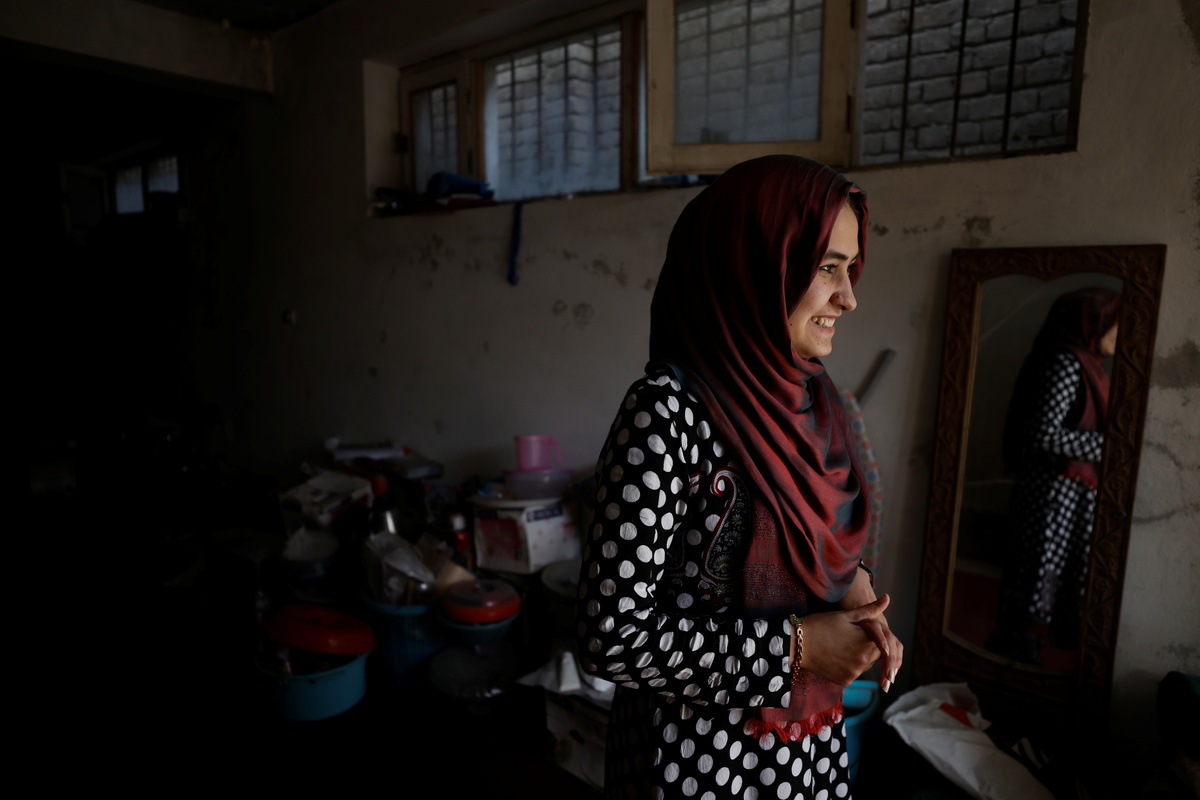 Hawa, 20, a third-year Russian literature student at the Burhanuddin Rabbani University (which was renamed by the Taliban to Kabul Education University), smiles as she talks to her sister at her home in Kabul, Afghanistan, October 23, 2021. REUTERS/Zohra Bensemra.