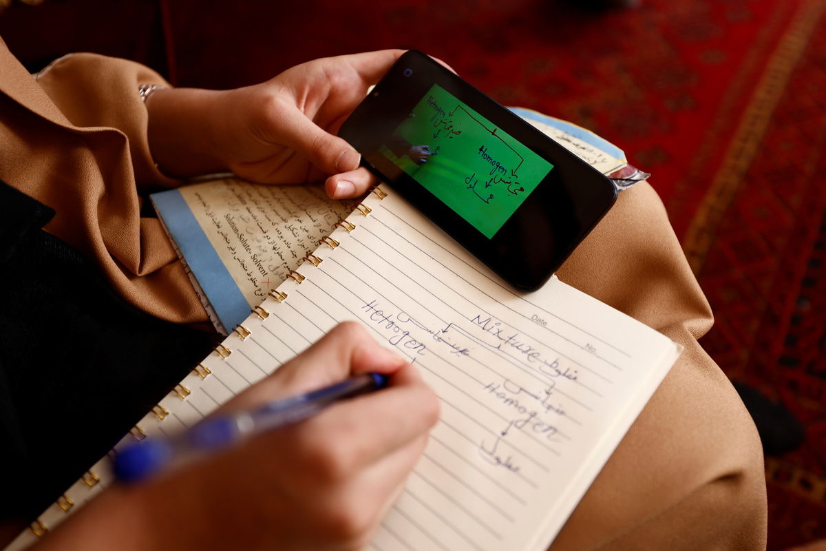 Across town, 17-year-old Sahar is also stuck at home. She wants to become an engineer, but, for now at least, has to learn at home as best she can.