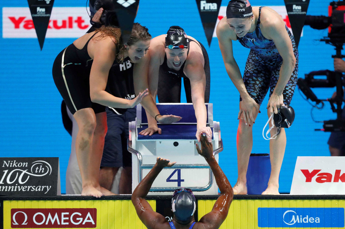 In their dominating performance at the championships, the U.S. claimed six of the 11 world records set in Budapest. Katie Ledecky, who did not swim on Sunday, finished as the leading female swimmer with her five gold medals and one silver. Manuel collected five golds and a bronze.