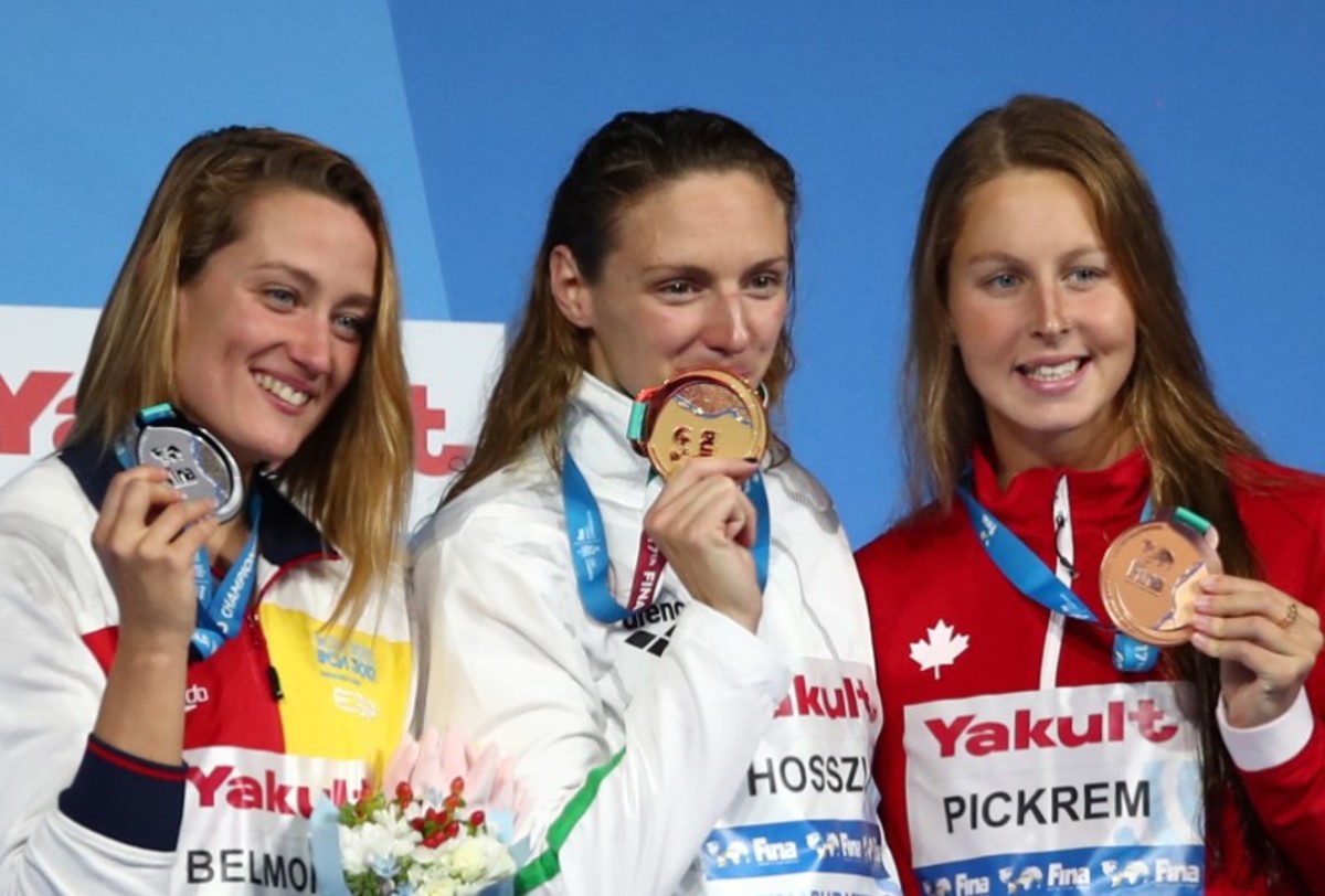 The 12,000-strong crowd roared Hosszu on to a championship record time of four minutes 29.33. Mireia Belmonte of Spain won silver, with Canadian Sydney Pickrem claiming bronze.