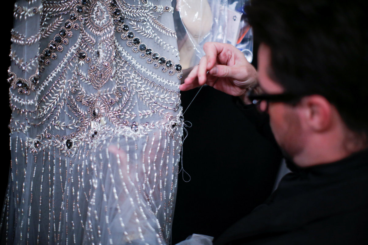 People work at backstage before Marchesa SS 2018 collection show during New York Fashion Week in New York City, U.S. September 13, 2017. REUTERS/Eduardo Munoz