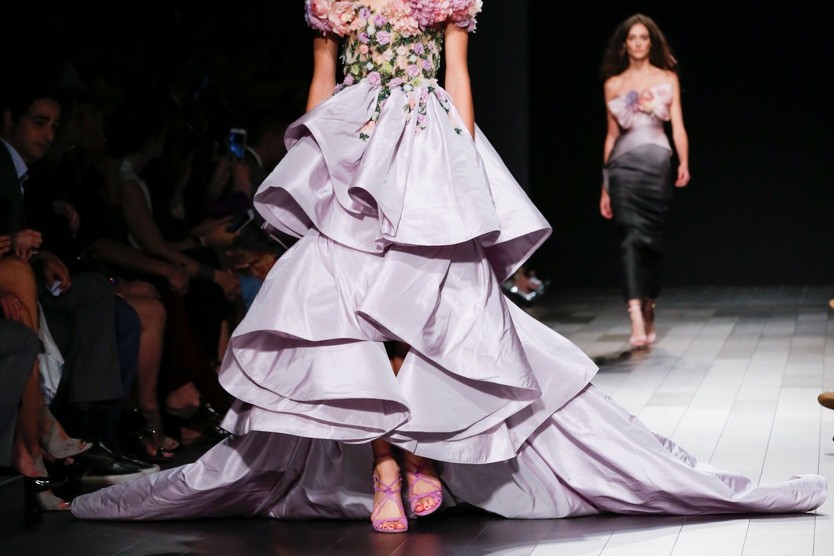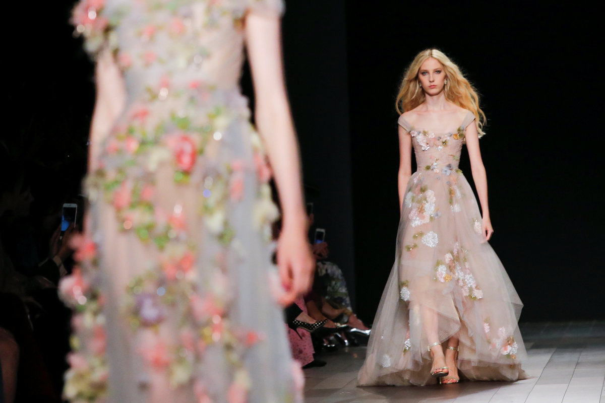 The dressmakers stayed true to their feminine, romantic style, showing delicate gowns with dramatic bows and heavy embroidering.