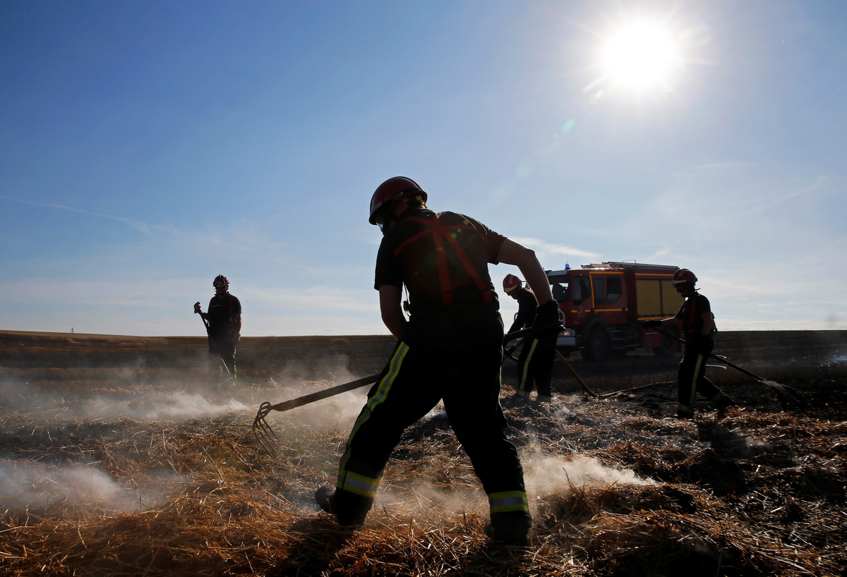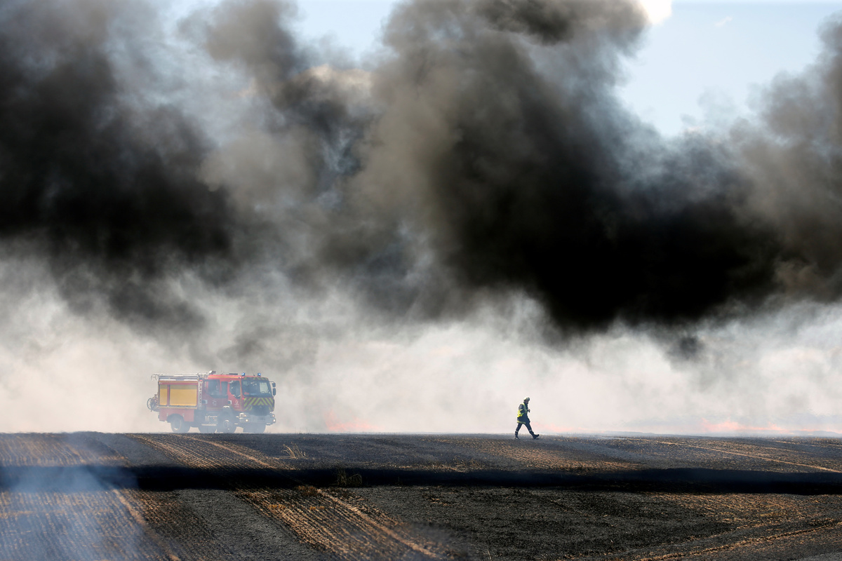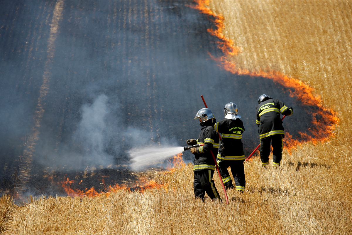 AUBENCHEUL-AU-BAC, France (Reuters) - On a farm in France, firefighters beat down the flames that had turned a field of wheat black, but they were too late to save the combine harvester. Caught in the blaze, it belched out flames and thick smoke while the farmer looked on helpless.