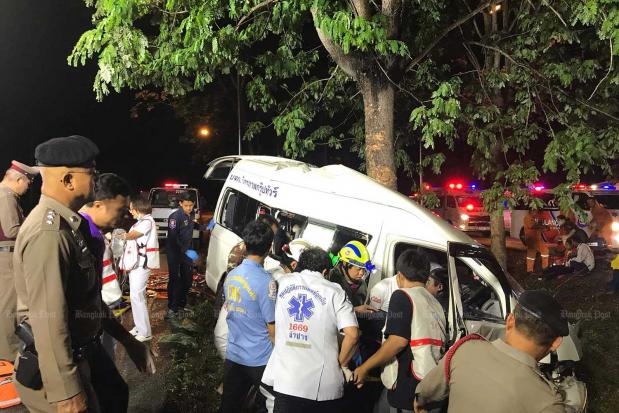 Police and rescue workers arriving at the scene found a white van with Samut Sakhon licence plates crumpled against a tree in the centre ditch.