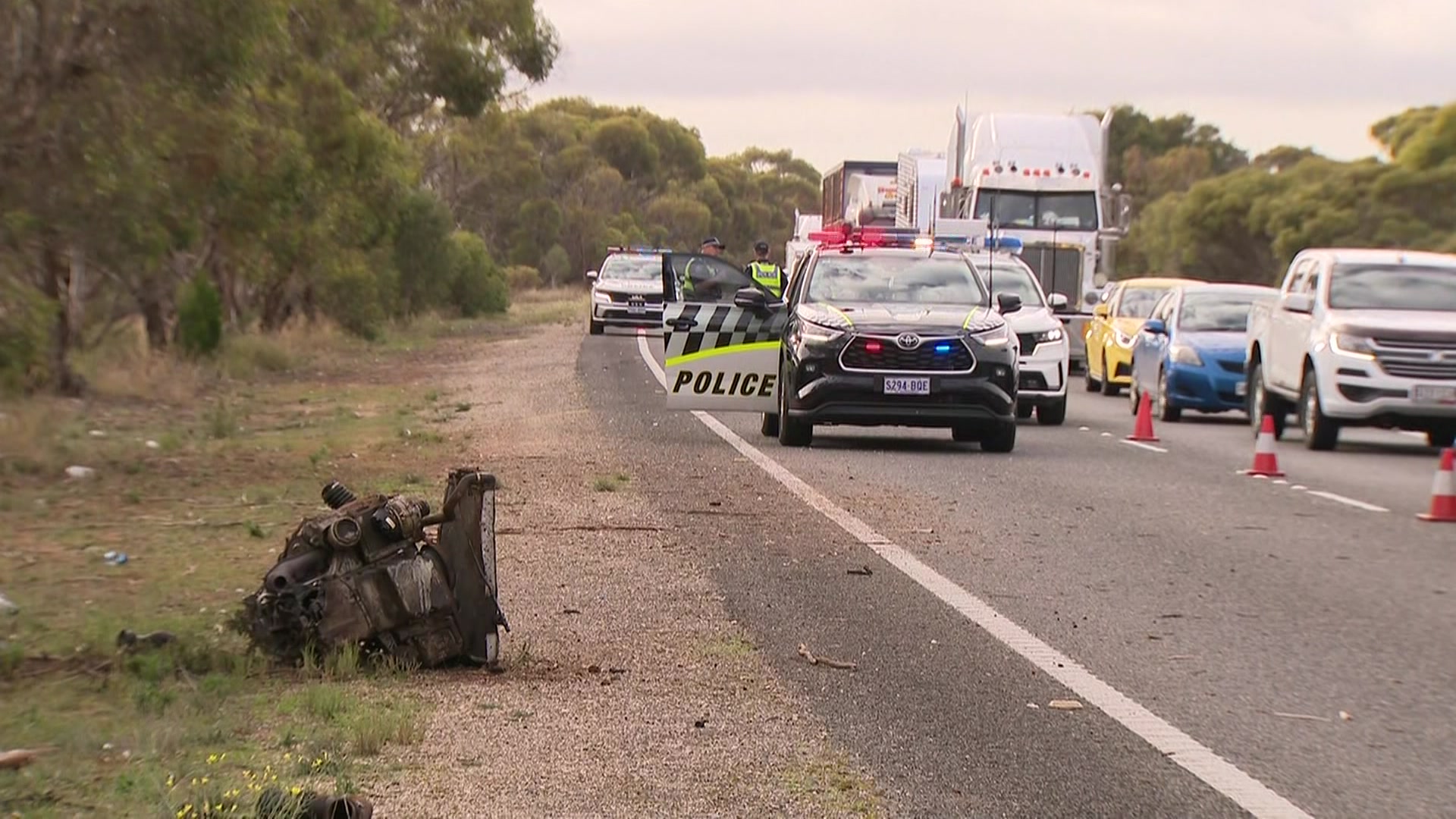 Emergency services were called to Monarto South at about 7.15am after reports a car had left the freeway and crashed into a tree.