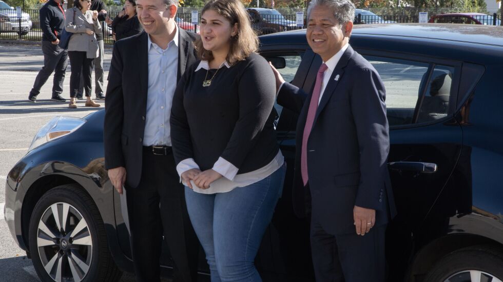 Taft two years ago was among the first schools to receive electric vehicles and charging stations paid for by ComEd’s EVs for Education grant program, and the cars are favorites of Taft’s student drivers, said junior Lina Aburukbah, who took ComEd CEO Gil Quiniones and Chicago Public Schools CEO Pedro Martinez for a spin around the school’s parking lot in one of two new Nissan Leaf EVs.