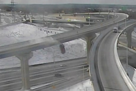 A Wisconsin Department of Transportation camera captured Saturday's crash in which the pickup can be seen flipping over the a barrier wall and plummeting to the interstate below as cars pass by. The truck landed upright on the right shoulder of the westbound lanes of Interstate 94.