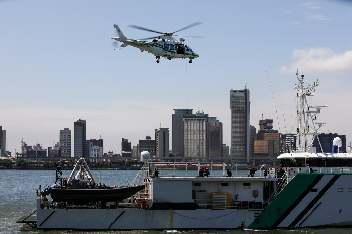 Helicopters hover above a patrol vessel in Nigeria's frenetic Apapa port as attack boats zoom past. On the dock, drones emblazoned with the Nigerian flag sit ready to deploy – all part of a $195 million U.S.-backed "Deep Blue" initiative to deter pirate attacks in the world's most dangerous area for seafarers.