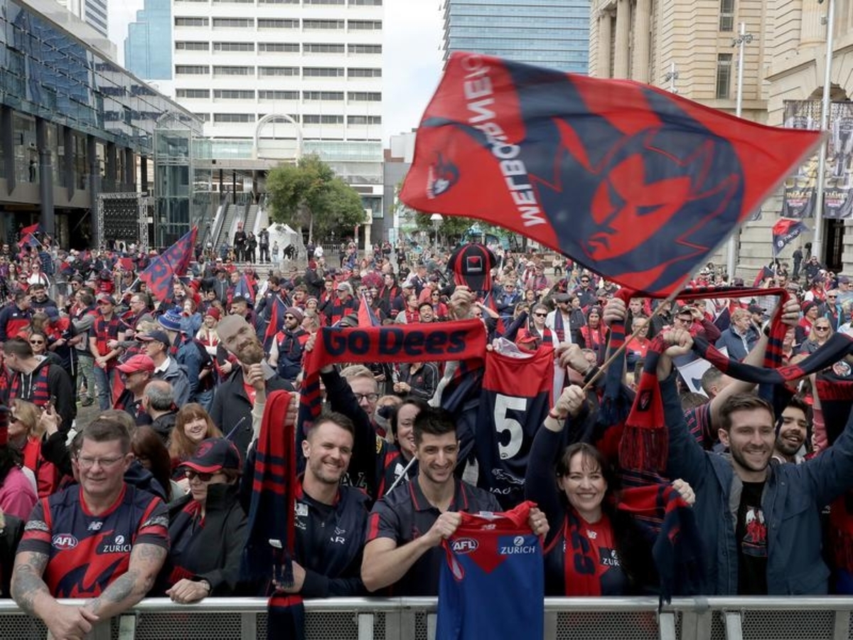 A morning thunderstorm failed to dampen the enthusiasm of the Demons faithful, who gathered early to watch a replay of Saturday's 74-point Optus Stadium triumph on the big screen and erupted at key moments like they were seeing it all for the first time.
