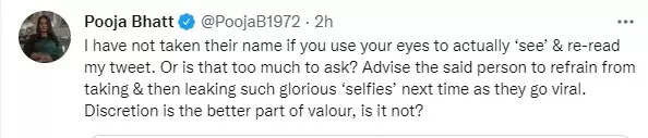 She wrote, ‘I have not taken their name if you use your eyes to actually ‘see’ & re-read my tweet. Or is that too much to ask? Advise the said person to refrain from taking & then leaking such glorious ‘selfies’ next time as they go viral. Discretion is the better part of valour, is it not?’