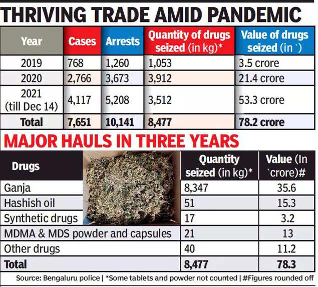 BENGALURU: The number of people arrested for possession, consumption and dealing of drugs in Bengaluru saw a 42% jump between 2020 and 2021 — from 3,673 to 5,208.