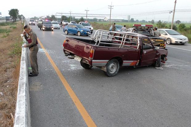 Rescue workers called to the scene said the red pickup, registered in Sing Buri province, ran into a safety wall alongside the median-strip flood ditch on Highway 32 in tambon Tha Chanuan.