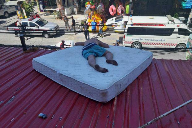 Police at Chalong station in Muang district were informed about 10.30am that two foreigners were lying, unmoving on an awning on the second floor of a small hotel on Soi Khok Makham in tambon Rawai. The callers feared they may have tried to commit suicide and needed assistance.
