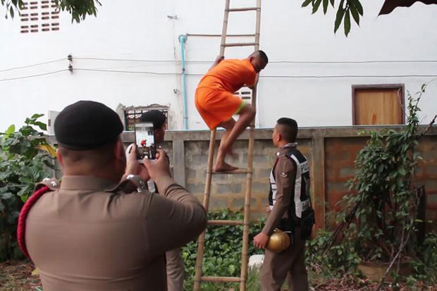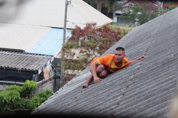 Weerachet Sukcharoen, 22, a native of tambon Chiang Khruea of Muang district, was arrested after climbing down a ladder that police set up for him from the rooftop of an apartment building in the morning.