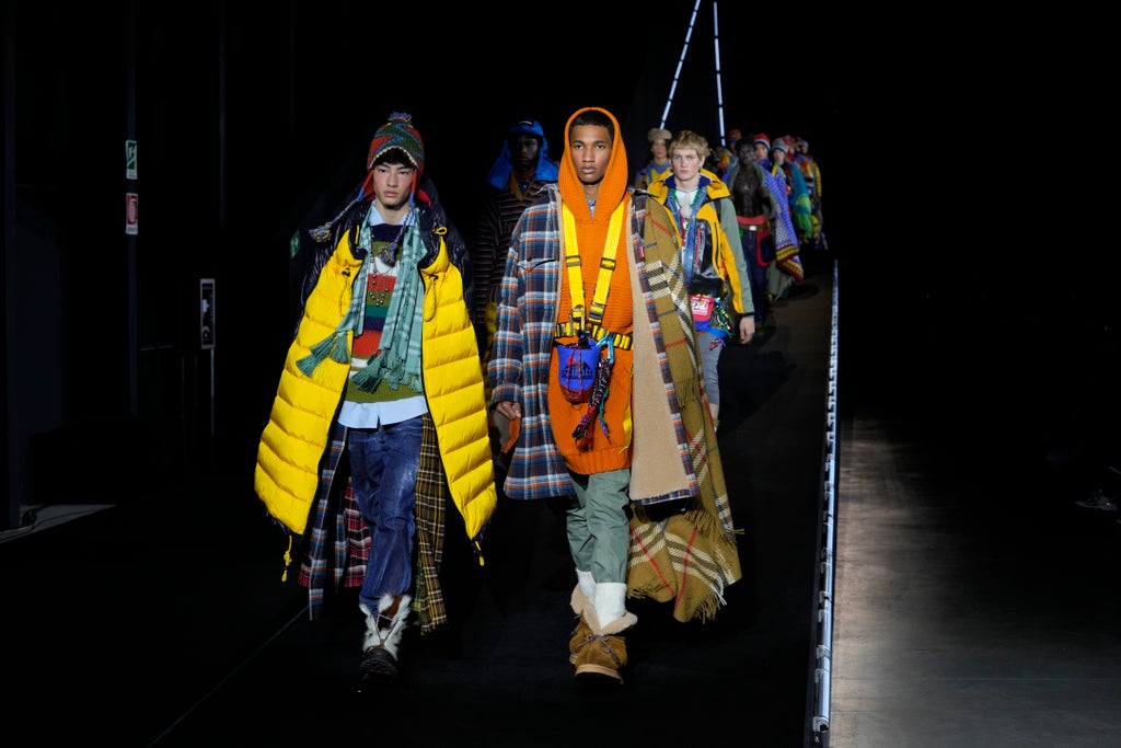 "It has been two long years, and it feels great to be back,'' the twins intoned, before unveiling a colorful and cozy Canadian mash-up of puffer coats, quilted shorts over jeans, layered with delicate wool blankets — just the ticket for getting back out in the open-air mix and away from the surging crowds.