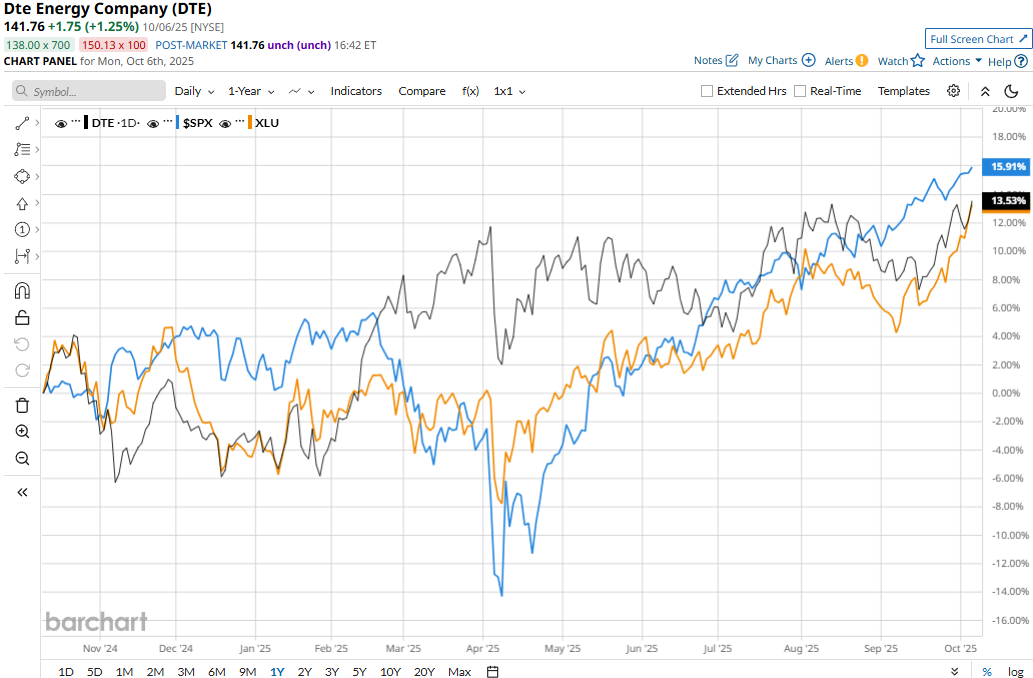 DTE stock prices have gained 11.6% over the past 52 weeks, outperforming the Utilities Select Sector SPDR Fund’s (XLU) 10.4% returns, but lagging behind the S&P 500 Index’s ($SPX) 17.2% surge during the same time frame.