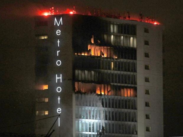 “Firefighters using breathing apparatus inside hotel to search & extinguish.”