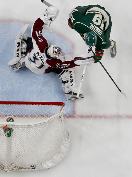 Much of the period was played in the Avs' zone, with an assertive, confident Wild offense repeatedly setting up good scoring chances. Hanzal was the first to strike, scoring the third goal of his 17-game tenure with the Wild on a play that made him look up at the scoreboard and smile. Charlie Coyle, in the right circle, spotted Hanzal gliding down the slot and hit him with a pass that Hanzal tucked past goalie Calvin Pickard.