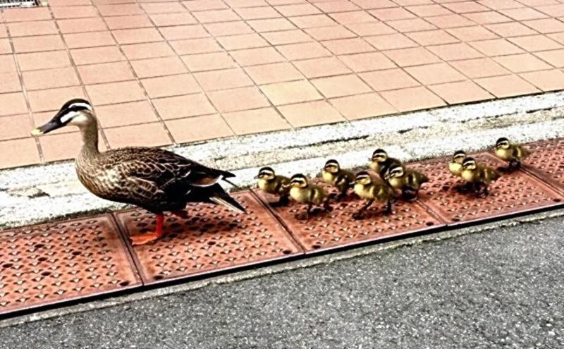 Nine ducklings that hatched at the pond at Musashino City Daisan Elementary School were led by their mother to Inokashira Park about 600 meters south of the school. The mother and her ducklings completed their about 30-minute journey without any problems as the school's janitors kept them safe by stopping traffic.