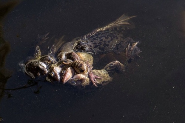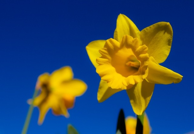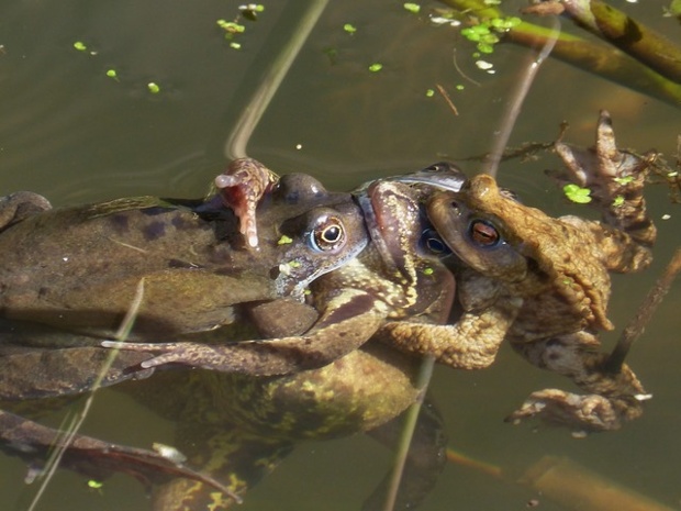 "During the mating period, male frogs and toads are prone to cling to any suitable sized moving object in the water. In this case a female frog has been gripped (a state of amplexus) by two male frogs (one with only eyes visible) and , on the right a male toad." Photograph: SimonRandolph"What a difference a month makes from the storms that did so much damage to a lovely blue sky spring day." Daffodils on a lovely spring day in Devon. Photograph: Matt RoffePrimrose refracted in a dewdrop. Photograph: Jenny Downing