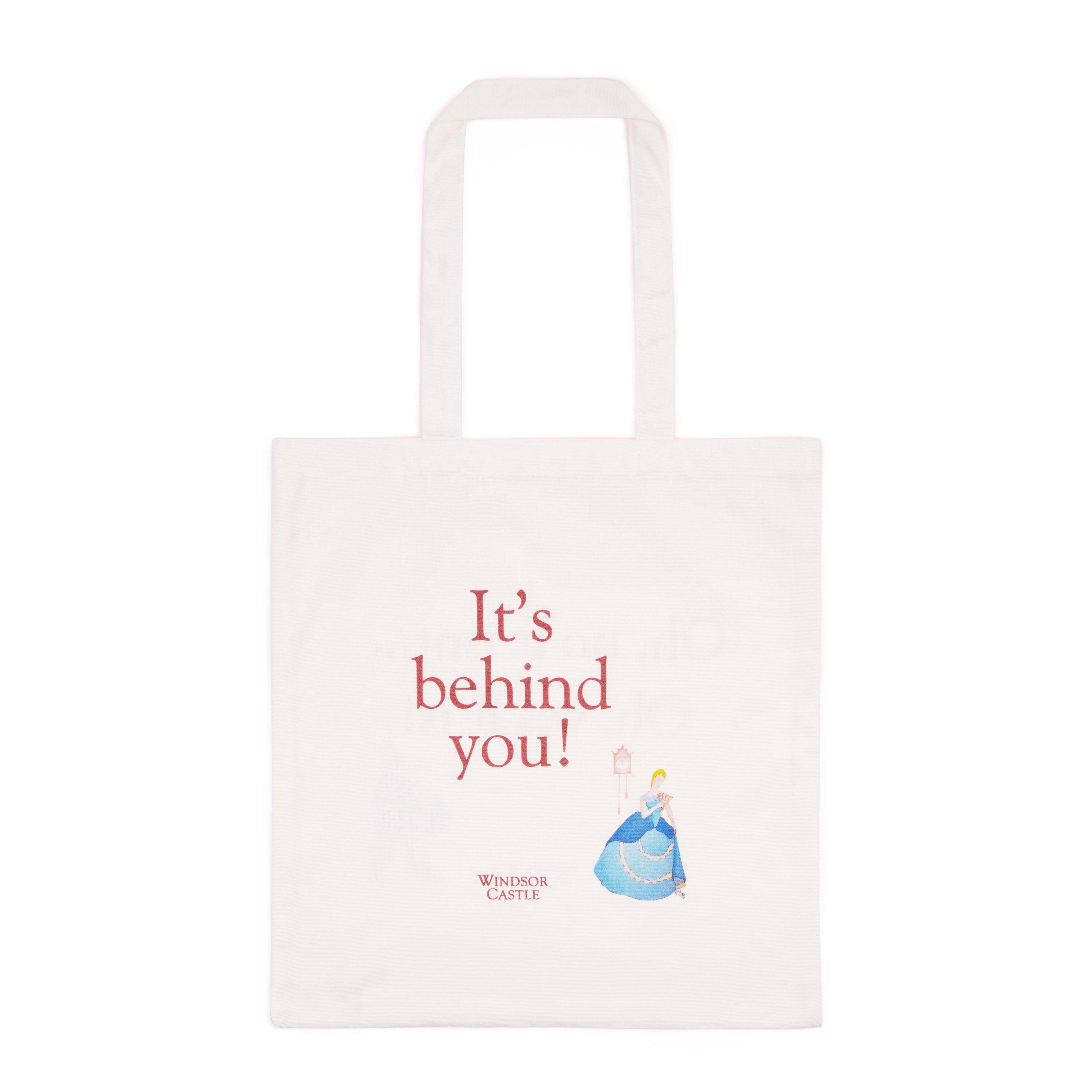 It includes a tote bag featuring the words “It’s behind you” for £8.95, a mug at £15, a set of colouring pencils for £8.95, and a tea towel featuring pantomime characters which costs £9.95.