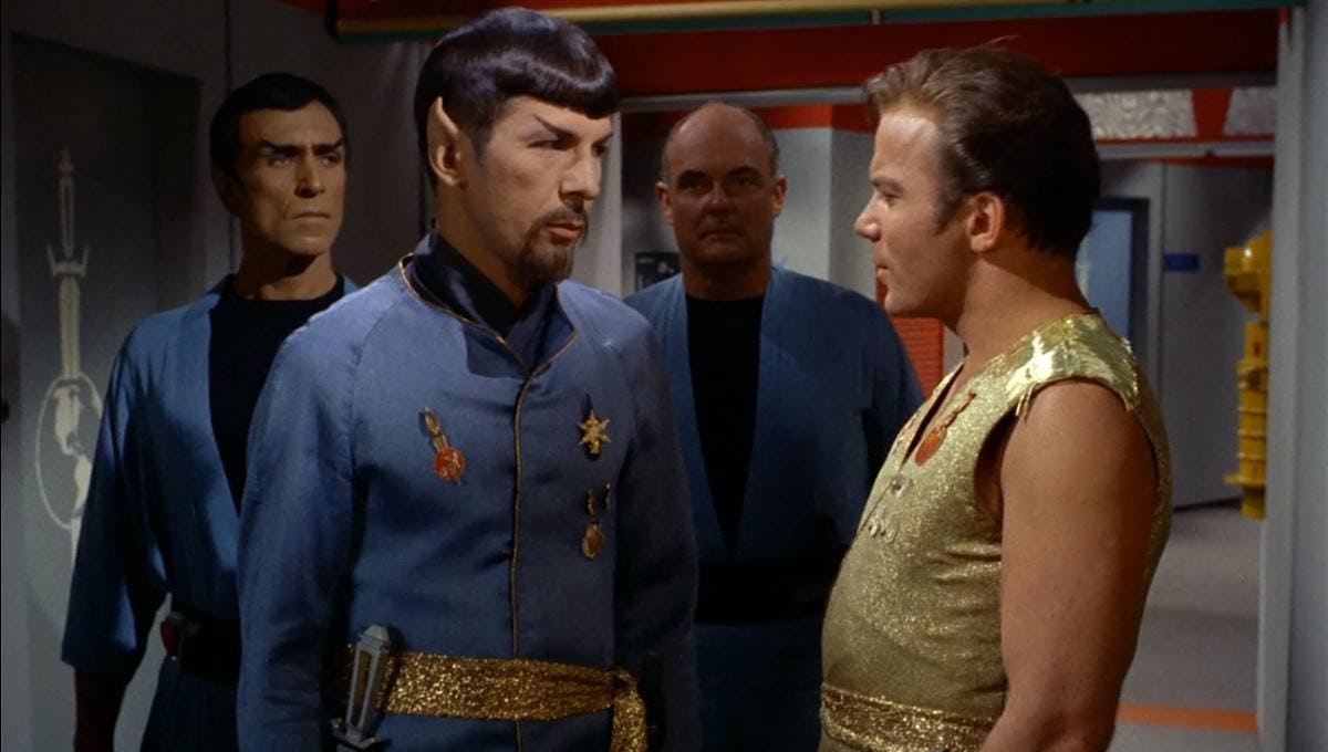 Then Kirk, Bones, Scotty, and Uhura are zapped in a parallel dimension — the famous "Mirror Universe"— in which an evil version of the Enterprise is forcibly extracting the dilithium from the peaceful Halkans. On one level, "Mirror, Mirror" is meant to show the differences between the "good" universe and the "bad" universe, but a closer reading of the episode (and subsequent trips to the Mirror Universe) actually just demonstrate how close the line is between a peaceful partnership and outright conquest. For a moment, in "Mirror, Mirror," Star Trek presents a conflict very similar to Dune — a planet with a substance that is desperately needed for spaceflight and an Empire willing to do anything to get that substance.