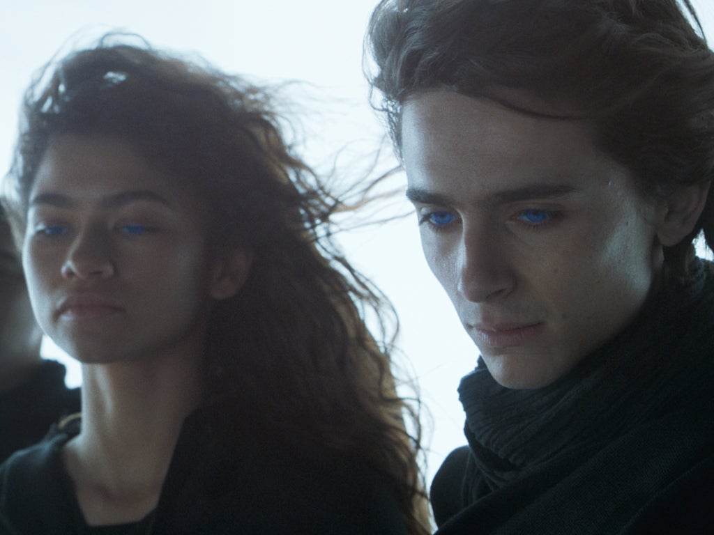 Villeneuve allows the terrible, suffocating weight of Paul’s destiny to infect every frame of Dune – from the sterile, muted palette of his homeworld Caladan to the gold-flecked haze of Arrakis. Figures traverse across vast landscapes, while miniature swarms of spaceships gather like invading insects. That smallness allows, too, for some humanity. There is a fragility to these characters, upheld by a cast of actors all too smart to be swallowed up by portentousness. Chalamet will always have his sheepishness, Zendaya a cutting clarity to her voice.