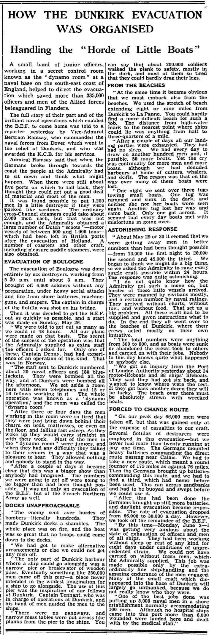 A small band of junior officers, working in a secret control room known as the “dynamo room” at a naval base on the south-east coast of England, helped to direct the evacuation which saved more than 335,000 officers and men of the Allied forces beleaguered in Flanders. The full story of their part and of the brilliant naval operations which enabled the BEF was told to a reporter yesterday by Vice-Admiral Bertram Ramsay, who commanded the naval forces from Dover.