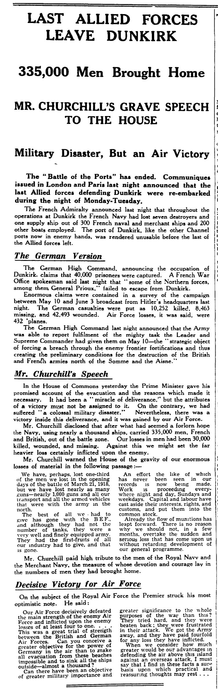 In the House of Commons yesterday the Prime Minister gave his promised account of the evacuation and the reasons which made it necessary. It had been a “miracle of deliverance,” but the attributes of a victory must not be assigned to it. On the contrary, we had suffered “a colossal military disaster.” Nevertheless, there was a victory inside this deliverance, and it was gained by our Air Force.