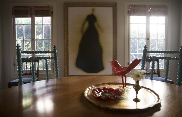 Multitasking. A 20-foot-long hallway was cut down to size with curtains to create portieres that signal the entrance to the master bedroom suite. "Behind the curtains, a pair of swing doors outfitted with a grosgrain ribbon bulletin board provides vertical space for me to display family photos and other mementos," says Chambers. Again, an example of giving multipurposes to individual items.