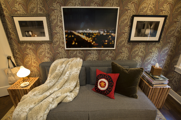 Look up. "Custom pendant lights and artwork installed up high make the not-so-big living room feel larger by drawing the eye up to the high barrel ceiling," Chambers says. He also installed a pop-up television in a credenza which allows him to display artworks when the TV is not in use. It also holds throws and bedding for overnight guests.