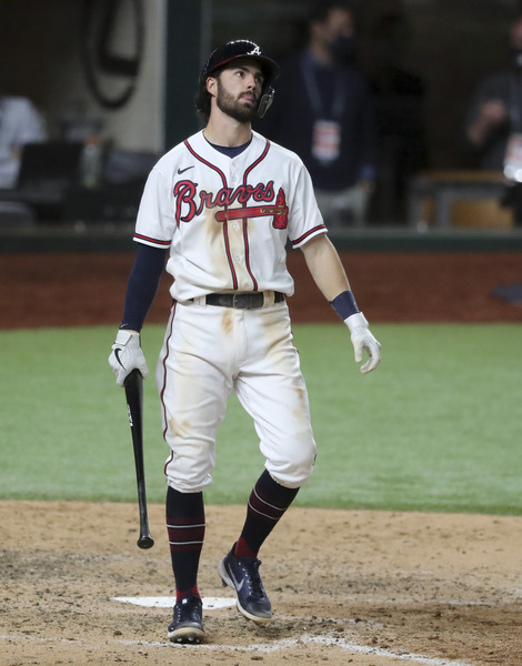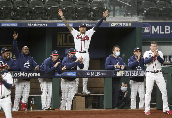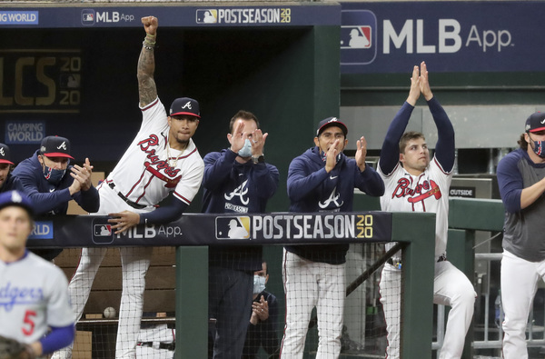 Atlanta Braves players watch from the dugout after the Los Angeles Dodgers took the lead with a three-run home run by Will Smith in the sixth inning in Game 5 of the National League Championship Series on Friday, Oct. 16, 2020, at Globe Life Field in Arlington, Texas. (Curtis Compton/Atlanta Journal-Constitution/TNS)