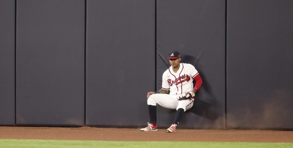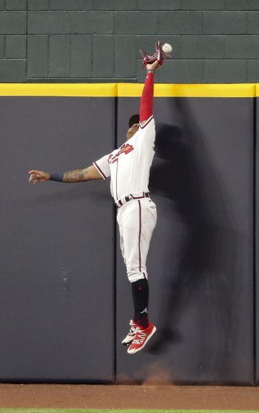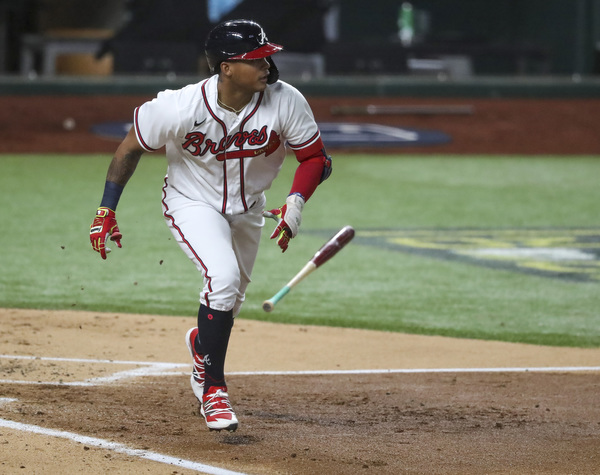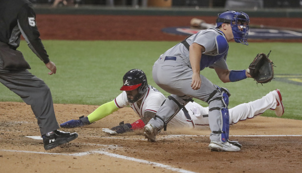 The Atlanta Braves' Marcell Ozuna appears to score on a sacrifice fly by Dansby Swanson, but the play was overturned on review in the third inning against the Los Angeles Dodgers in Game 5 of the National League Championship Series on Friday, Oct. 16, 2020, at Globe Life Field in Arlington, Texas. (Curtis Compton/Atlanta Journal-Constitution/TNS)