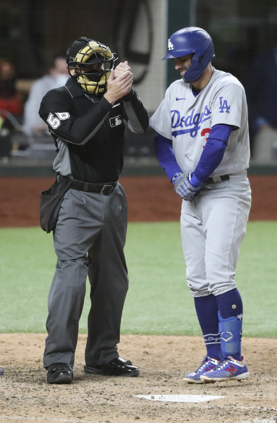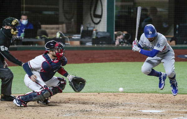 The Los Angeles Dodgers' Chris Taylor (3) reacts to being hit, but on review it was ruled the ball hit the bat, in the seventh inning against the Atlanta Braves in Game 5 of the National League Championship Series on Friday, Oct. 16, 2020, at Globe Life Field in Arlington, Texas. (Curtis Compton/Atlanta Journal-Constitution/TNS)