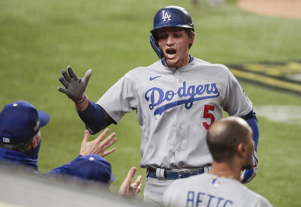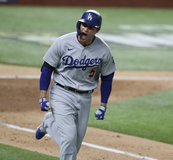 The Los Angeles Dodgers' Corey Seager celebrates his two-run home run in the seventh inning against the Atlanta Braves in Game 5 of the National League Championship Series on Friday, Oct. 16, 2020, at Globe Life Field in Arlington, Texas. (Curtis Compton/Atlanta Journal-Constitution/TNS)