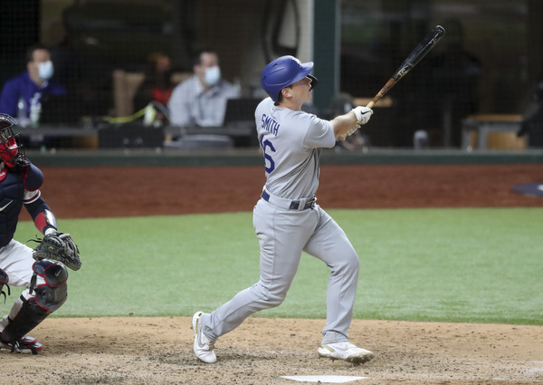 The Los Angeles Dodgers' Will Smith celebrates his three-run home run in the sixth inning against the Atlanta Braves in Game 5 of the National League Championship Series on Friday, Oct. 16, 2020, at Globe Life Field in Arlington, Texas. (Curtis Compton/Atlanta Journal-Constitution/TNS)