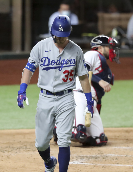 The Los Angeles Dodgers' Corey Seager strikes out swinging in the first inning against the Atlanta Braves in Game 5 of the National League Championship Series on Friday, Oct. 16, 2020, at Globe Life Field in Arlington, Texas. (Robert Gauthier/Los Angeles Times/TNS)
