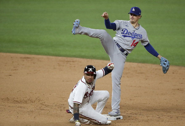 Los Angeles Dodgers second baseman Enrique Hernandez (14) turns a double play over the Atlanta Braves' Johan Camargo on a grounder by Cristian Pache in the seventh inning in Game 5 of the National League Championship Series on Friday, Oct. 16, 2020, at Globe Life Field in Arlington, Texas. (Curtis Compton/Atlanta Journal-Constitution/TNS)