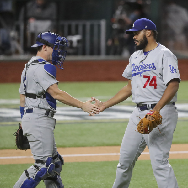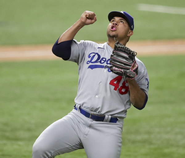Los Angeles Dodgers pitcher Brusdar Graterol celebrates the final out in the eighth inning against the Atlanta Braves in Game 5 of the National League Championship Series on Friday, Oct. 16, 2020, at Globe Life Field in Arlington, Texas. The Dodgers won, 7-3, to force a Game 6. (Curtis Compton/Atlanta Journal-Constitution/TNS)