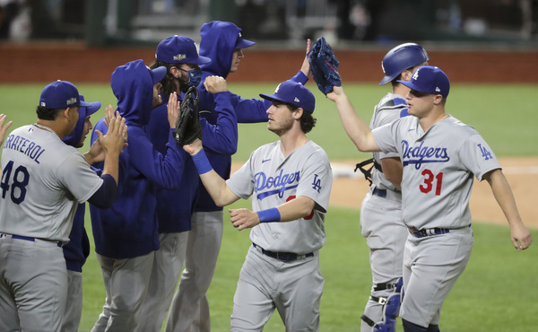 The Los Angeles Dodgers celebrate after the final out in a 7-3 win against the Atlanta Braves in Game 5 of the National League Championship Series on Friday, Oct. 16, 2020, at Globe Life Field in Arlington, Texas. The Dodgers' win forces a Game 6. (Curtis Compton/Atlanta Journal-Constitution/TNS)
