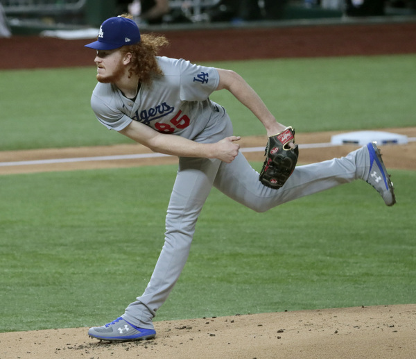 Los Angeles Dodgers starting pitcher Dustin May works in the first inning against the Atlanta Braves in Game 5 of the National League Championship Series on Friday, Oct. 16, 2020, at Globe Life Field in Arlington, Texas. (Robert Gauthier/Los Angeles Times/TNS)