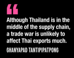 "Although Thailand is in the middle of the supply chain, a trade war is unlikely to affect Thai exports much," she said. "There is only a small proportion of Thai product items that appear in the list of US-China tariff measures, compared with total export items from Thailand. Anyway, business operators shall prepare for a flexible business plan, especially for financial reserves and cash flow management to handle either a positive or negative situation that might occur in the future."