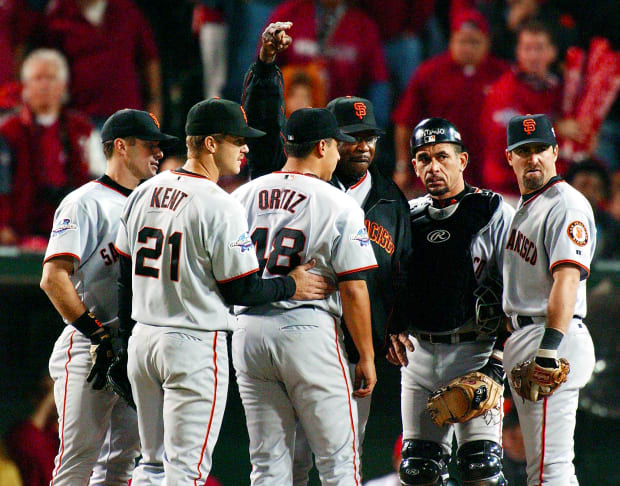 In 2002, Baker came closer to winning the World Series than any manager has without actually winning it. His Giants led the Angels, 5–0, with eight outs to go. No team had ever lost such a big lead in a potential clincher. Baker removed his starting pitcher, Russ Ortiz, with two on and a pitch count of 98. The bullpen crumbled. San Francisco lost, 6–5.