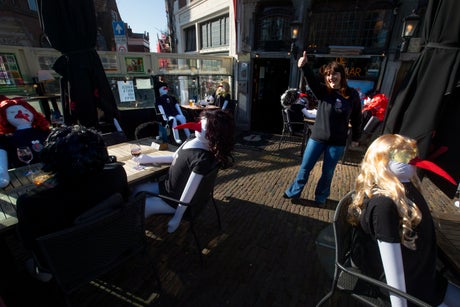 With tough coronavirus measures shutting Dutch cafes and restaurants since mid-October, Bender's guests Tuesday were all white inflatable dummies dressed in T-shirts, wigs and large red noses. They were part of a protest that saw an unknown number of cafes across the country symbolically open their terraces amid growing opposition to the lockdown from hard-hit businesses.